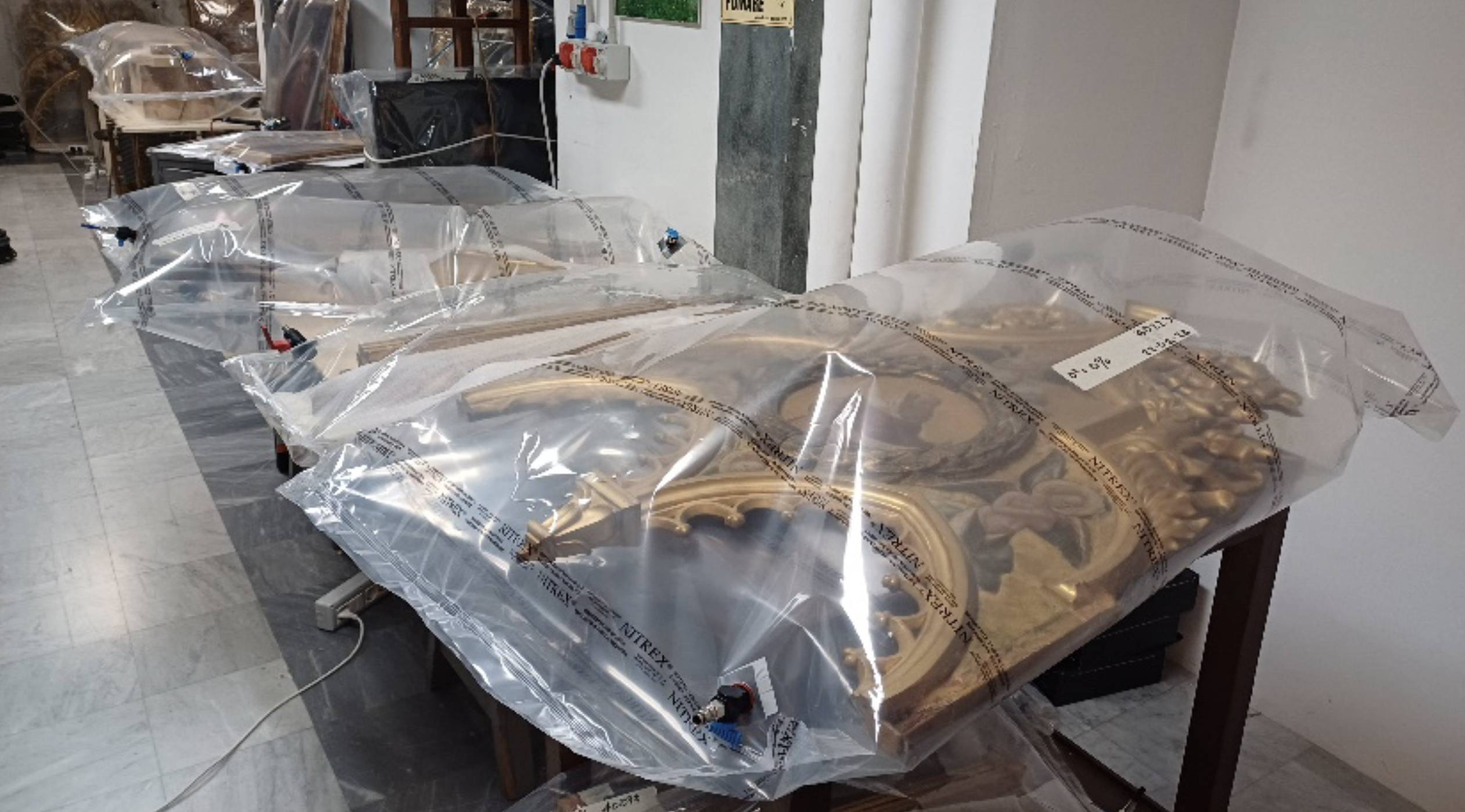 After careful observation under grazing light, the restorers performed minor bandaging where the paint film appeared lifted or unadhered before moving the painting. The veiling with Japanese paper and adhesive in water was done two days earlier to allow perfect drying before moving the work. Exactly as was the case two centuries ago, it was impossible to move the work without disassembling it, an operation that began before removing the polyptych from the wall by removing the highest brush strokes. The individual disassembled parts were placed in plastic bags to perform the anoxic treatment, including of course the frame. The anoxic nitrogen treatment is specifically for Cultural Heritage applications.