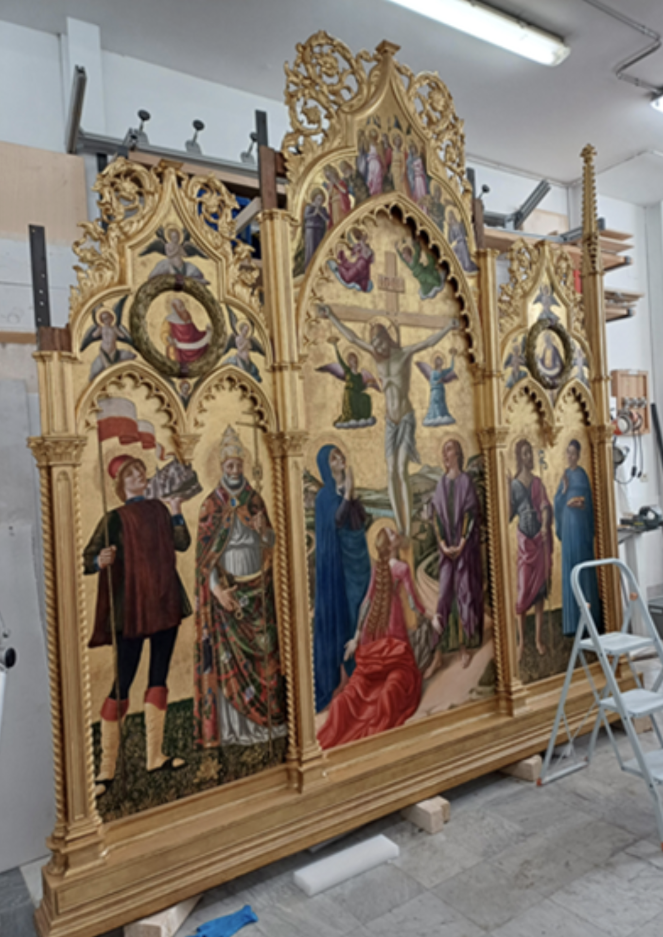 The restoration of the Triptych with Crucifixion and Saints is complete. The only thing left to do is to reassemble it in Room VI of the Pinacoteca.