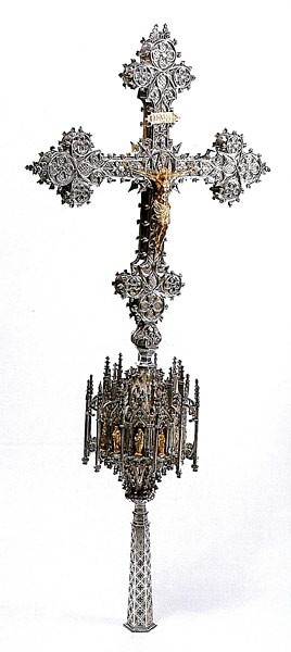 This processional cross was donated to Pope Pius IX and used during the opening of the First Vatican Council in 1869. It was born by a prelate of the papal court in front of the sedia gestatoria, the chair in which the pope was carried above the people. Unlike when carried at the front of a procession this cross was carried with the image of Christ facing the pope so he might meditate on the suffering of Jesus during the procession. Due to its size and weight, this neo-gothic masterpiece has only been used occasionally since 1869.