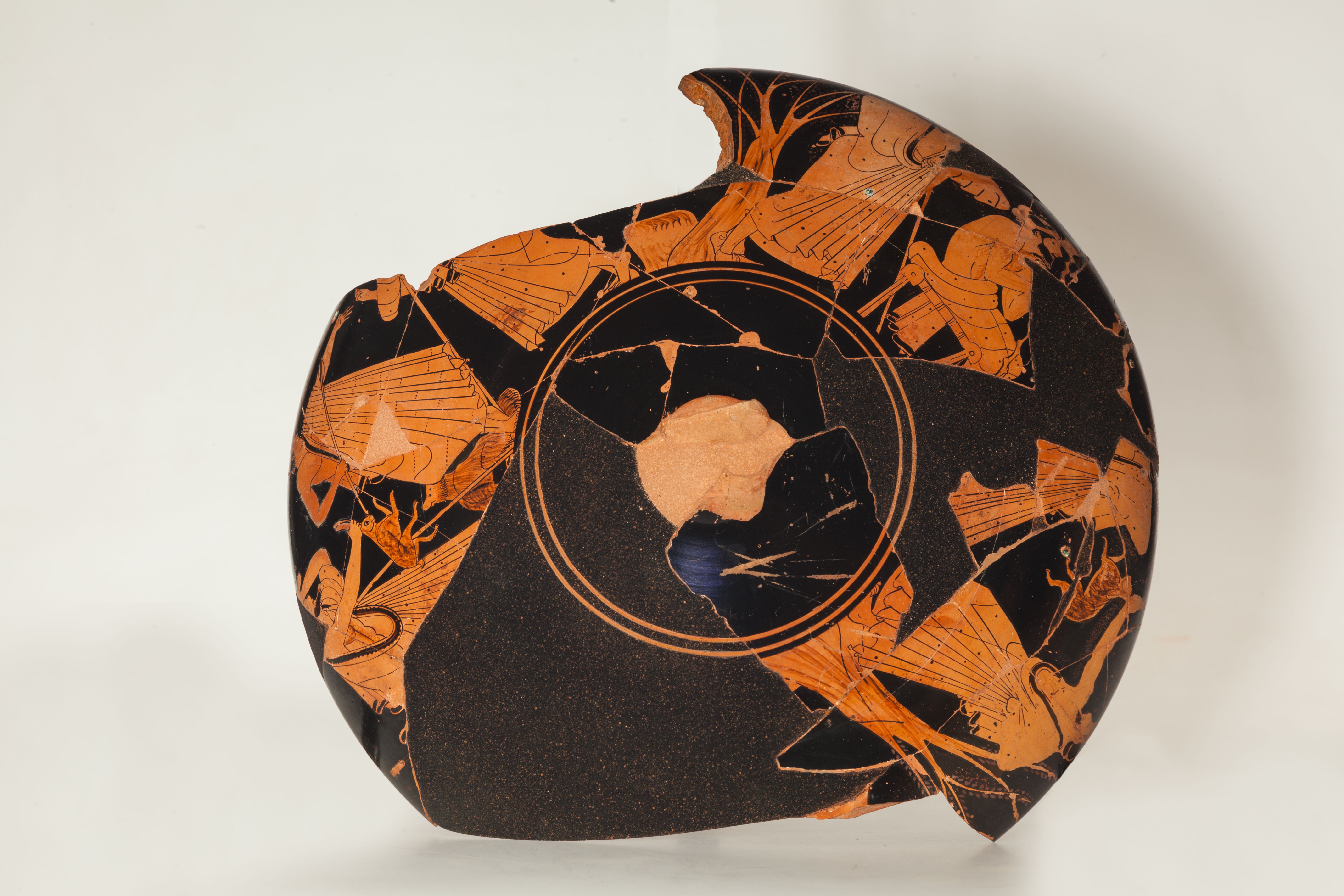 The world of Dionysus, the symposium, the ritualized consumption of wine, and Greek camaraderie are all shown in different representations. One particularly fine late archaic cup depicts a young boy drinking in a sitting position. The famous Oxford Scholar known for his classification of Attic pottery, Sir John Beazly, named the unknown painter of this cup “The Mario Painter” in honor of his friend Mario Astarita.