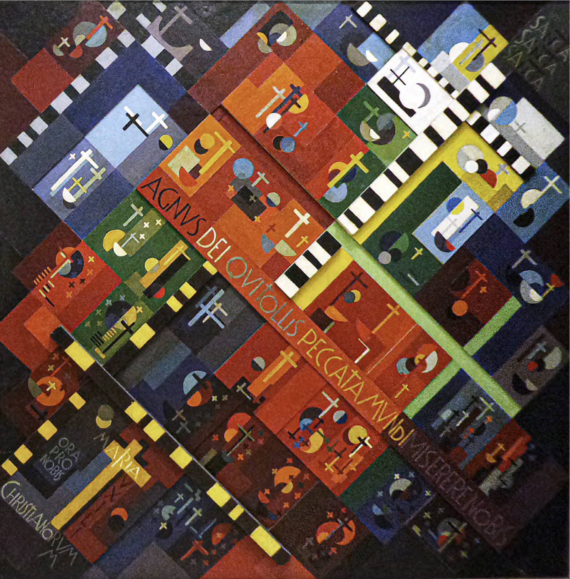 Then, the artist developed the theme with geometric shapes, spheres and hemispheres, rectangles of different sizes, and crosses. The religious message is conveyed directly through the inscriptions. Mario De Luigi's work, painted in 1949, is also a tribute to Mondrian's Victory Boogie-Woogie, painted between 1942 and 1944.