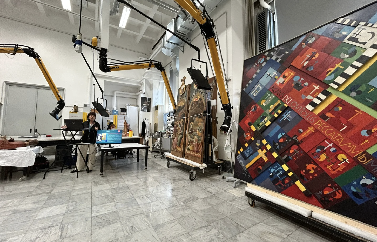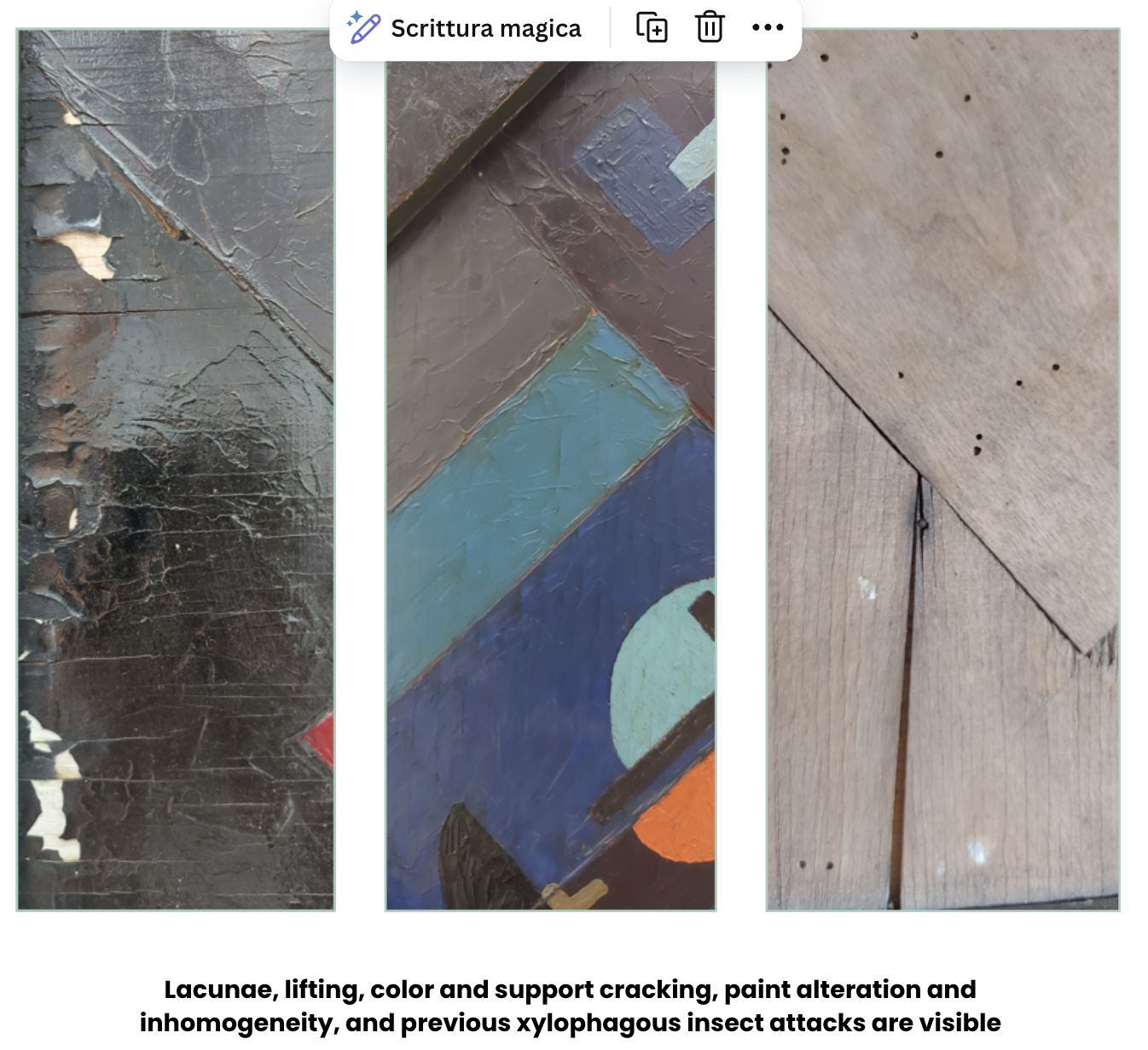 The restoration consisted of four major phases: Scientific studies to determine the state of conservation and the technique of execution Consolidation of the pictorial preparation/color layer and restoration of the wooden support Cleaning of the painted surface to recover the original color relationship Plastering chromatic reintegration and final painting After these stages, the new aluminum frame was mounted on the original wooden structure to allow the painting to be displayed on the wall in a rhomboid shape, respecting the intention of the artist. Before the restoration, the artwork painted on wood with overhanging panels showed an altered varnish on a large part of the painted surface, with visible unevenness compromising the color scheme. Several gaps, lifts, cracks, and previous xylophagous insect attacks were visible along the perimeter. The wooden support had some minor and medium cracks and damaged wooden parts. The grey perimeter batten, used as a frame, had stains, holes from the previous nailing, and some cracking