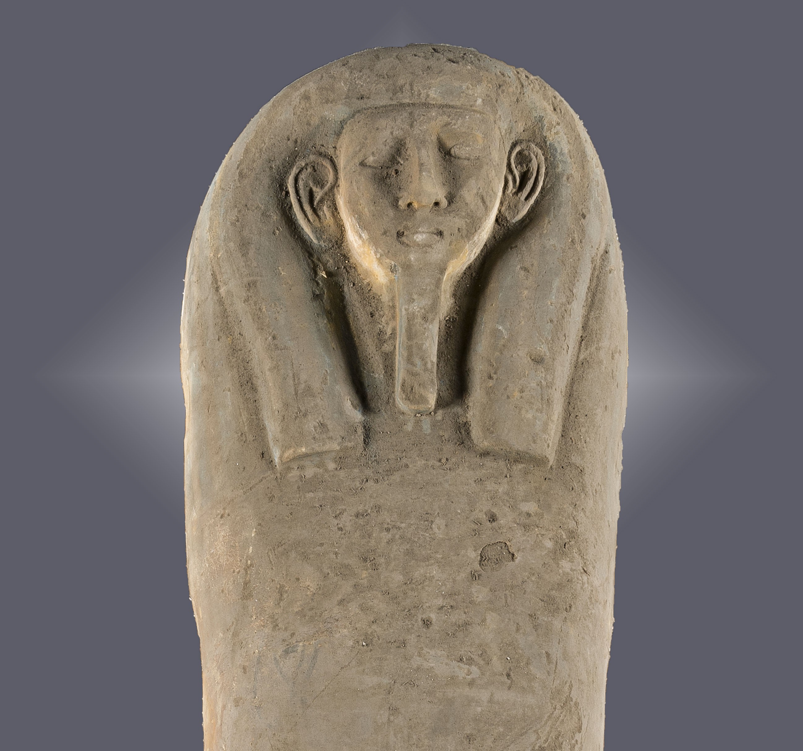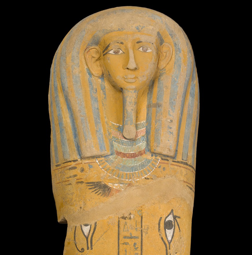 The beautiful yellow, fine-grain sandstone sarcophagus cover is painted on the external surface with multiple colors over a yellow background. A large yellow and blue striped hat exposes only the face and ears framing the face with a false beard, a symbol of regeneration. A necklace consisting of a series of rows adorns the chest of the figure.