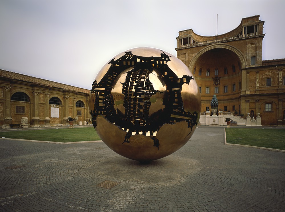 This sculpture, entitled "Sphere within Sphere" by Arnaldo Pomodoro, was donated by the artist in 1990 to the Vatican Museums, where it was installed in the Pinecone Courtyard. A complex assembly of this work by the artist himself is documented in the historical photos below, kindly provided by Dr. Micol Forti. The work is particularly striking in the architectural context of the courtyard, framed on one side by the dome of St. Peter's Basilica and the other from the monumental niche of the Pinecone. The sculpture is part of a vast production of similar spheres by Arnaldo Pomodoro and exhibited both in Italy and abroad. It is colossal and consists of a large sphere that contains a smaller one. The artist created this work by duplicating the same dimension of the golden ball topping the Dome of St. Peter’s. The "Sphere within a sphere", despite its colossal size, can self-rotate and is operated manually, thanks to a ball-bearing mechanism.It is said that it is also activated by the wind, blowing over Rome at sunset, with the strength to spin the ball and thus giving the spectator a unique play of light reflections. Arnaldo Pomodoro, who was trained as a goldsmith, has made a polished work, smooth and homogeneous in its spherical shape; but wide fissures show a glimpse of the dark and complex interior made of gears and geometric mechanisms. It is in contrast to the exterior, symbol, and metaphor for the dramatic confrontation between inside and outside, spirit and matter.